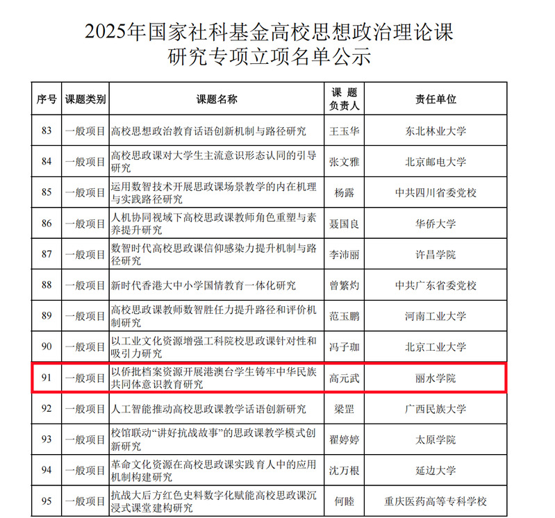 2026年1月7日,全国哲学社会科学工作办公室网站公布2025年国家社科基金高校思想政治理论课研究专项立项名单。丽水学院中华民族共同体研究院民族学系教师高元武申报的“以侨批档案资源开展港澳台学生铸牢中华民族共同体意识教育研究”项目立项为国家社科基金一般项目。