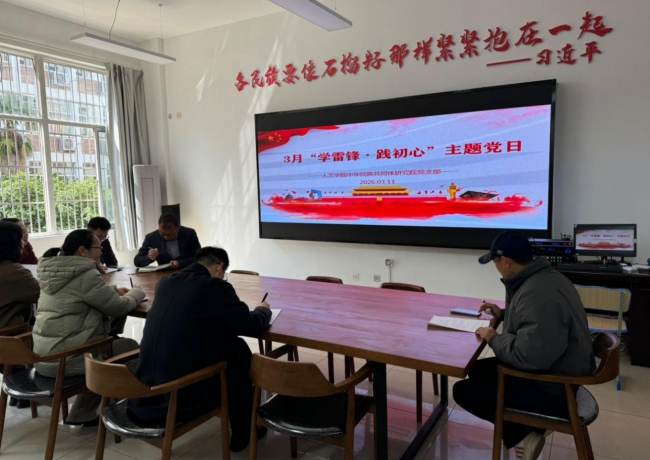 3月11日下午,中华民族共同体研究院党支部在8A105会议室开展“学雷锋·践初心”主题党日活动,全体党员重温入党誓词、学习党章,并围绕树立和践行正确政绩观开展专题学习。活动还组织观看了警示教育专题片,以实际行动践行雷锋精神、砥砺初心使命。